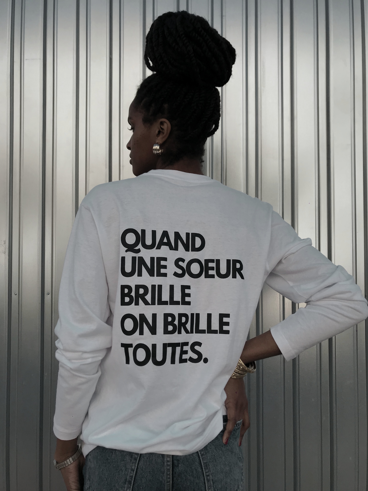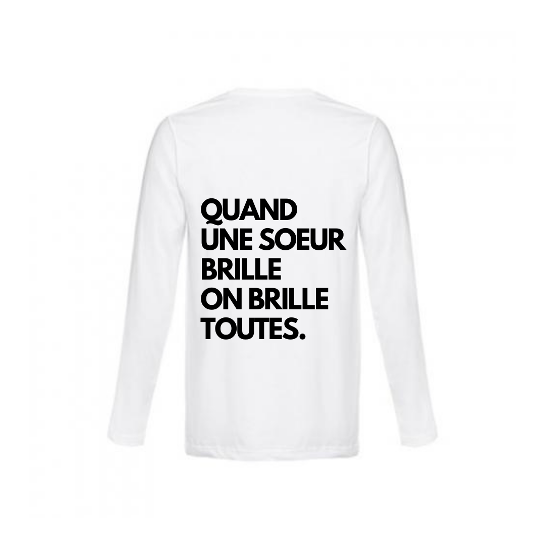 Détails : T-shirt classique manche longue unisex, coupe décontractée au logo SF brodé devant et notre devise " QUAND UNE SOEUR BRILLE ON BRILLE TOUTES. " floquée dans le dos.